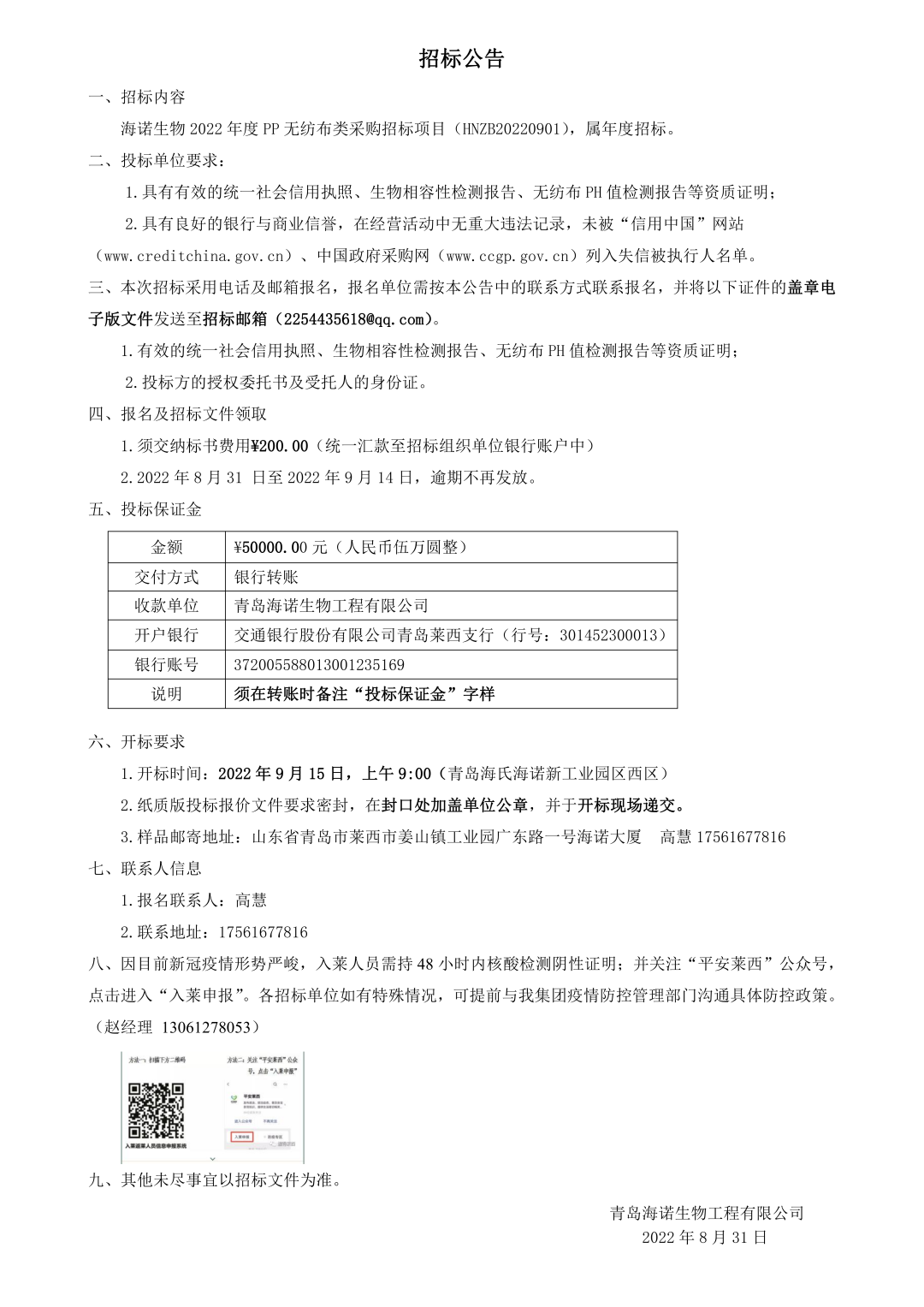 2022.09.152022年度海諾生物PP無(wú)紡布類采購(gòu)招標(biāo)正式開始,屆時(shí)我們將秉承公正、公平、公開、透明的招標(biāo)原則,期待優(yōu)秀供應(yīng)商的廣泛參與。具體招標(biāo)細(xì)節(jié)如下: