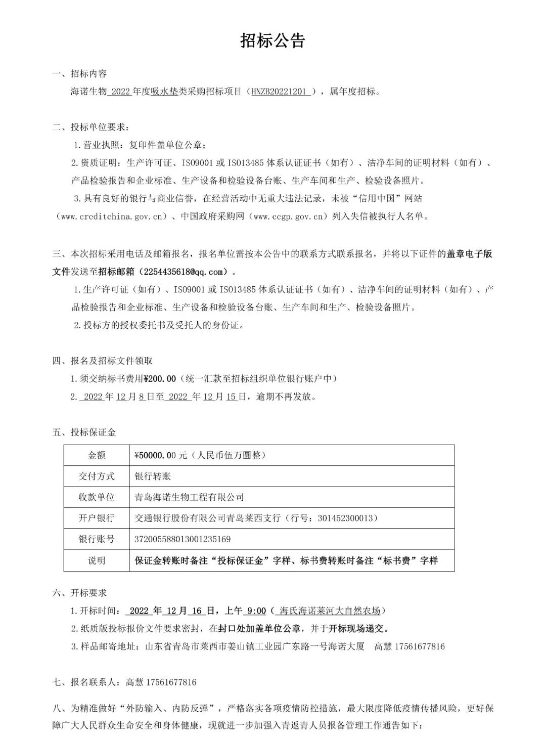 海諾生物2022年度吸水墊類采購招標項目正式開啟