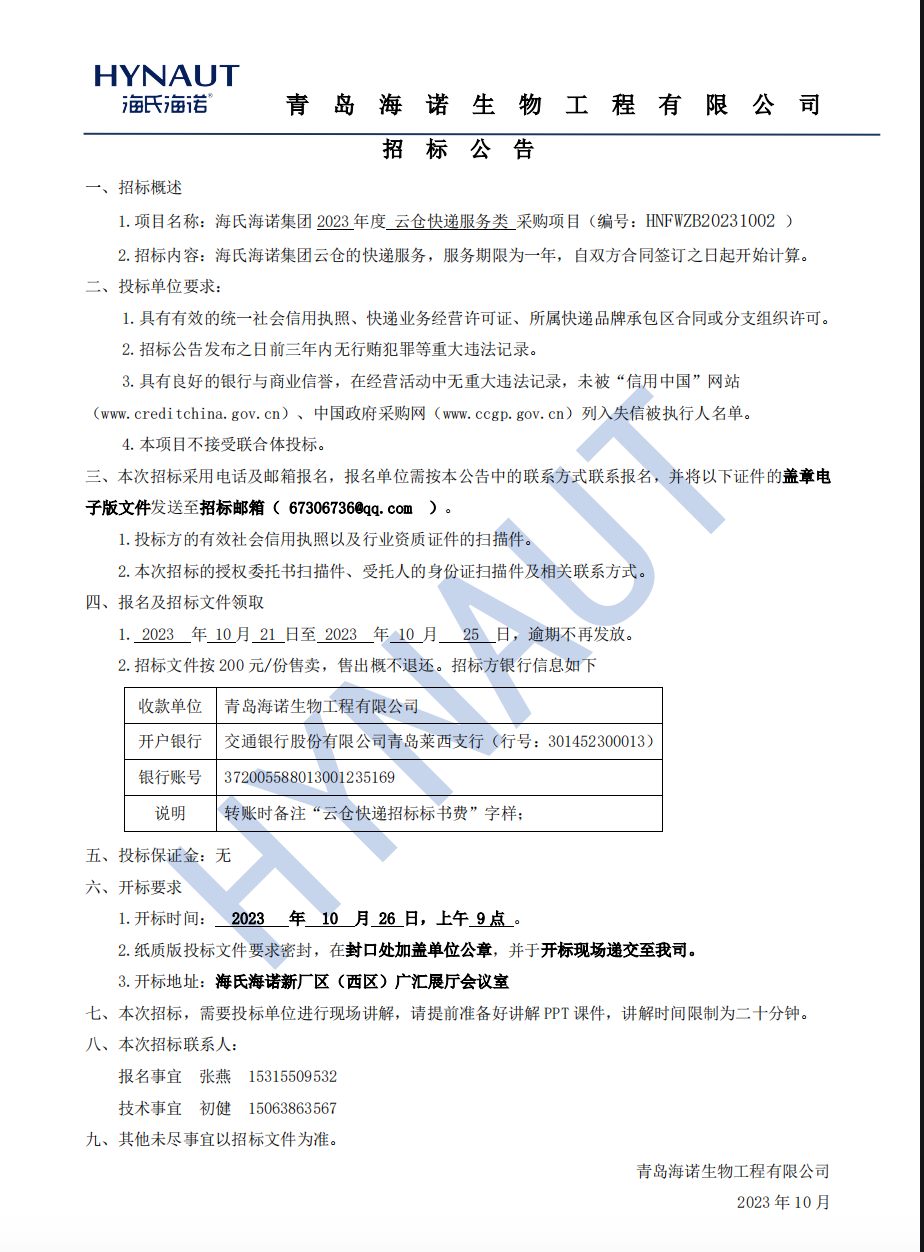 《海氏海諾集團(tuán)2023云倉快遞服務(wù)類采購項目招標(biāo)公告》
