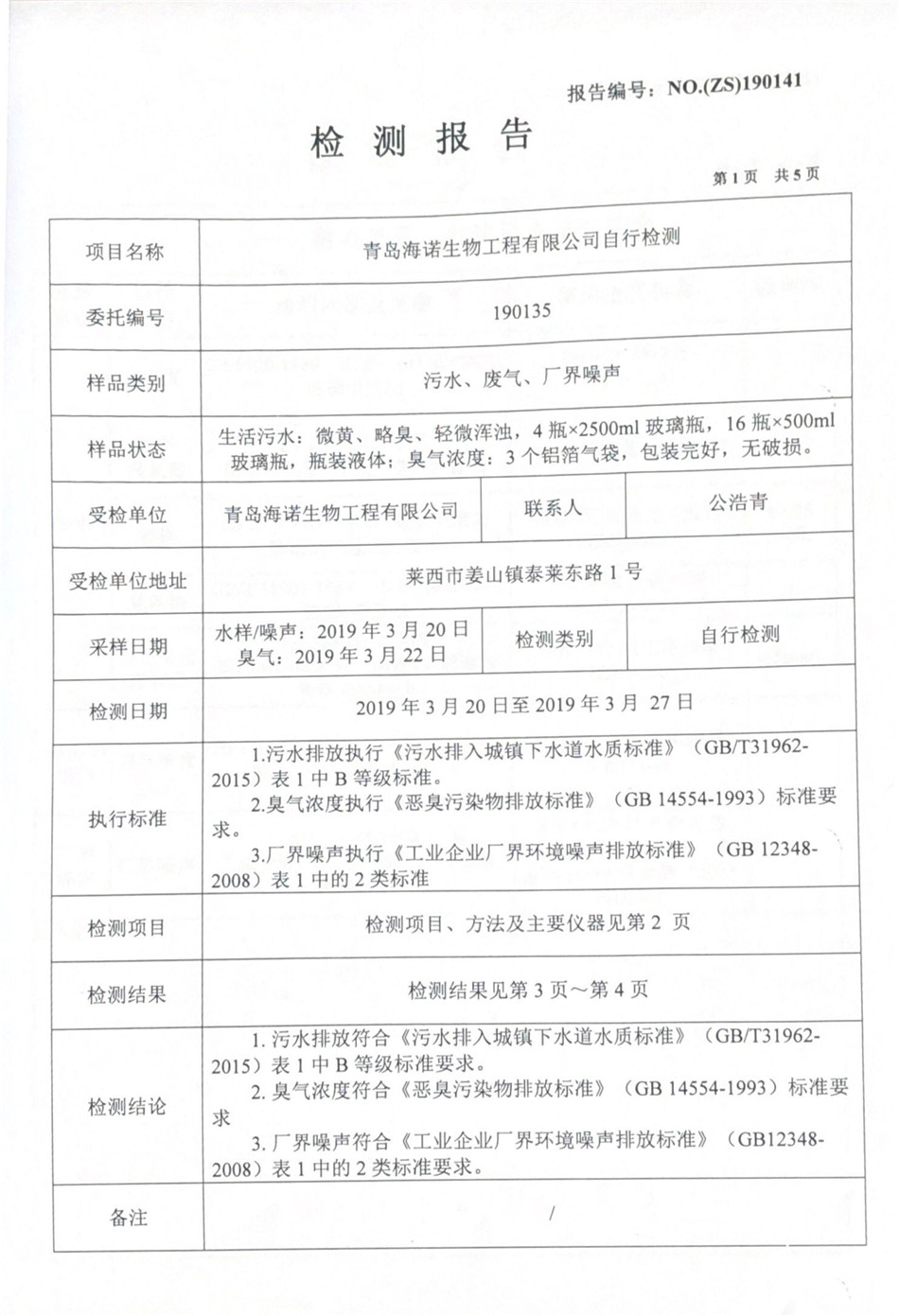 青島海諾生物工程有限公司自行檢測報告